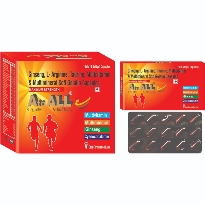 • Each Soft gelatin capsule contains : Ginseng Extract 42.5ng + Lycopene (6% dispersion) 5.7mg + Vitamin A (Retinyl Palmitate) 600mcg + Vitamin D3 (cholecalciferol) 200 IU + Vitamin B1 (Thiamine Mononitrate) 1.7mg + Vitamin B2 (Riboflavin-5 Phosphate Sodium) 2mg + Vitamin B6 (Pyridoxine Hydrochloride) 2.0mg + Vitamin B12 (Cyanocobalamin) 1mg + Vitamin E (DI-Alpha-tocopheryl) Acetate 5.0mg + Niacin (Nicotinamide) 10mg + Caldium D-Panthothenate 5mg + Folic Acid (n-pteroyl-L-glutamic Acid) 120 mcg + Zinc Sulphate Monohydrate Eq. to elemental zinc 7.5mg + Potassium lodine Eq. to Elemental lodine 75mcg. + Magnese oxide Eq. to Elemental Magnnesium 55mg + Magnesium Sulphate Eq. to Elemental Manganese 2mg + Ferrous Fumarate Eq. to Elemental Iron 7.5mg + Cupric Sulphate Eq. to Elemental Copper 1mg + Dibasis Calsium Phosphate 255mg + L-Arginine 25mg + Taurine 2.5mg + Excipients q.s.