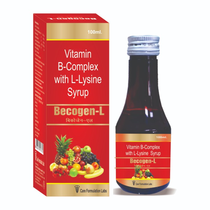 • Each 5ml. Contains Pyridoxine Hydrochloride I.P. 0.75mg Nicotinamide I.P. 15mg Cyanocobalamin I.P. 2mcg lysine Hydrochloride U.S.P 37.5mg Sorbitol Solution(70%) I.P. , Non-Crystallising,(colour Tartrazine) in a flavoured syrupy base.