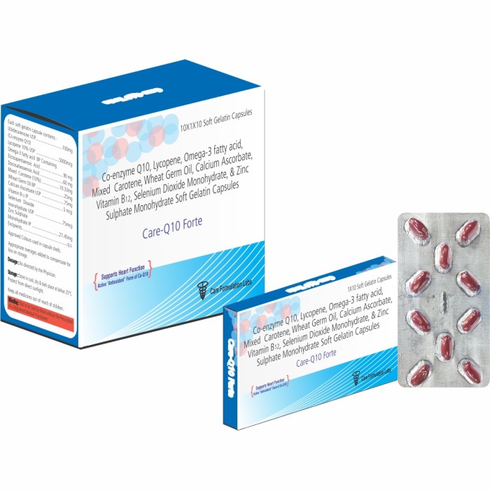 • Each Soft gelatin capsule contains: Ubidecarenone USP 100mg(CO-Enzyme Q10), Lycopene 10% USP.. 500mcg (Omega-3 fatty acid BP Containing ), Eicosapentaenoic Acid.. 90mg +Docosahexaenoic Acid..60mg +Mixed Carotene (10%).. 10.33mg +Wheat Germ Oil BP..25mg +Calcium Ascorbate USP.. 75mg +Vitamin B12 IP.. 5mcg (Selenium Dioxide), +Monohydrate USP..75mcg (Zinc Sulphate), +Monohydrate IP.. 27.45mg Excipients.. q.s.