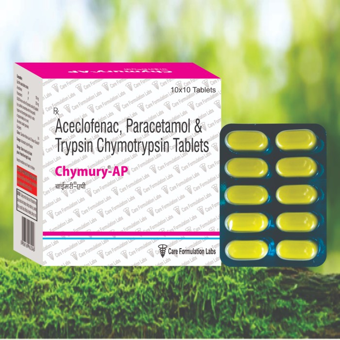 - Aceclofenac, paracetamol, and trypsin chymotrypsin is a combination of medicines used to treat pain and inflammation associated with a number of conditions, including: osteoarthritis, rheumatoid arthritis, spondylosis, spondylarthritis, and ortho-degenerative disorders.