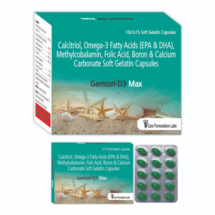 Composition : Each soft gelatin capsule contains : Calcitriol IP 0.25mcg. + Omega 3 Fatty acid Containing BP Eicosapentaenoic Acid 180mg + Docosahexaenoic Acid 120mg + Mehylcobalamin IP 1500mcg + Folic Acid IP 400mg + Disodium Tetraborate BP (eq. to elemental boron) 1..5mg + Calcium Carbonate IP 500mg + Excipients q.s.